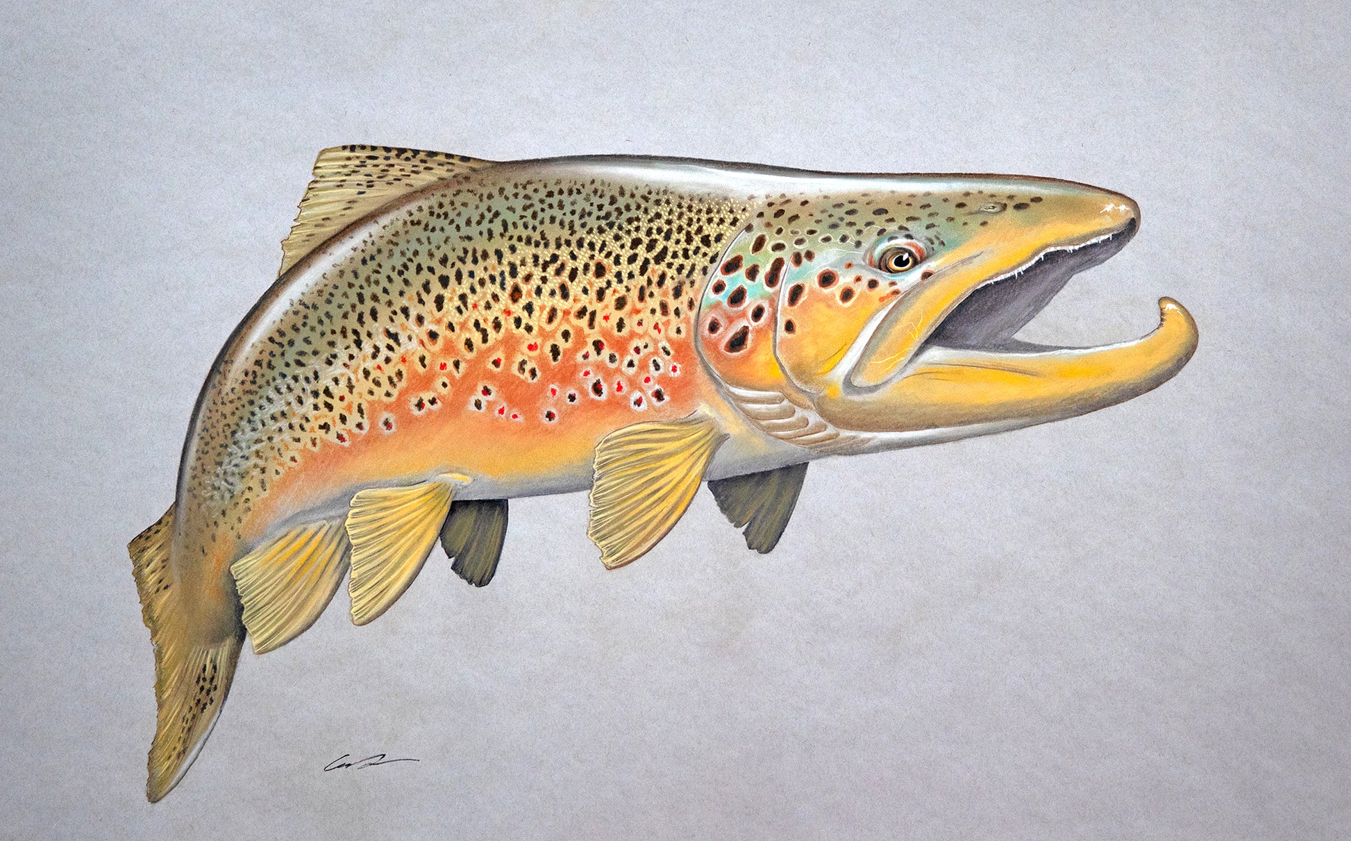 Garrison Doctor, co-founder and designer at RepYourWater is an artist at heart. This is a giclée reproduction of his "The Beast" pastel original. Inspired by the Brown Trout we all hope will come out to play when we step into the water...